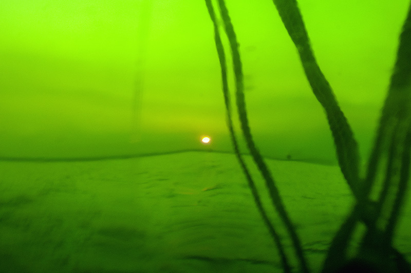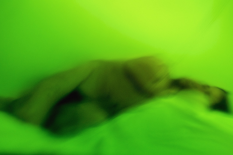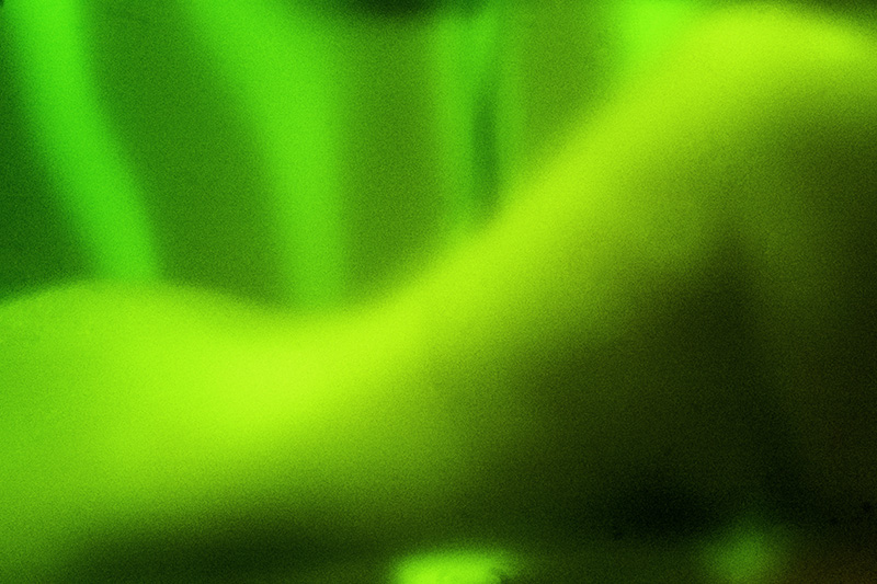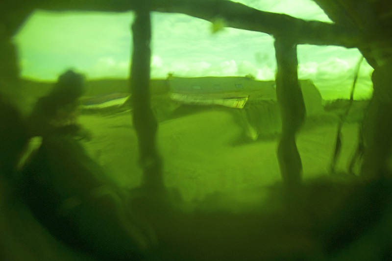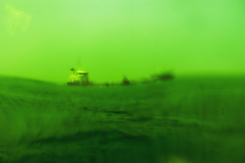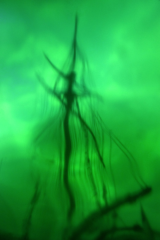 Un filtre analogique à la prise de vue, une bouée traditionnelle en verre et verte, confère naturellement aux photographies ces déformations et ce voile de couleur. Ces effets soulignent les flux et les reflux des impressions du narratif, entrainant le regard dans une contemplation vague, une fascination de soi pris dans la houle de l'existence. L'histoire, sans but de résolution, entraîne dans cette traversée intime. L'abstraction figurative des images ouvre dés lors la voix au chant des possibles, absorbé en même temps par l'attraction et la répulsion de ces vertes chimères.