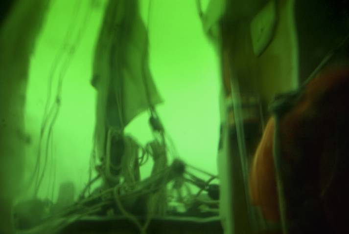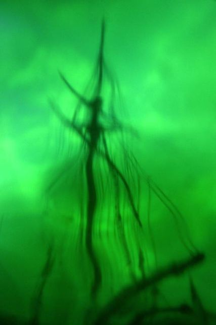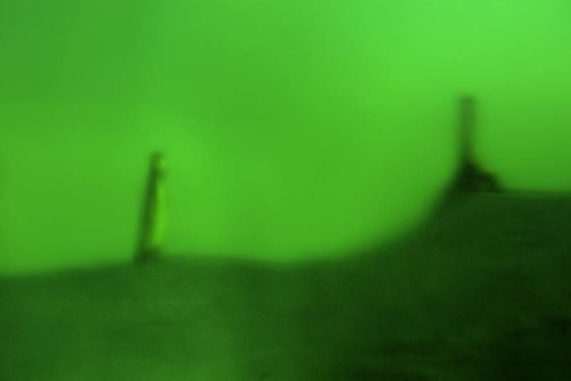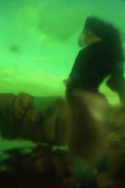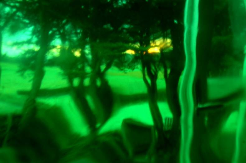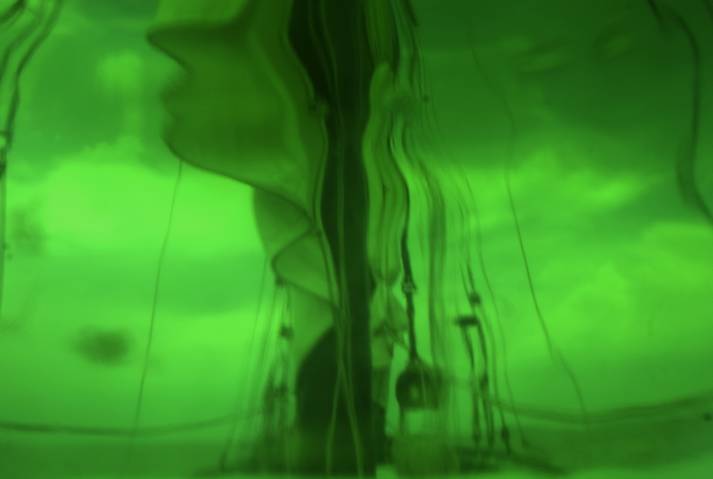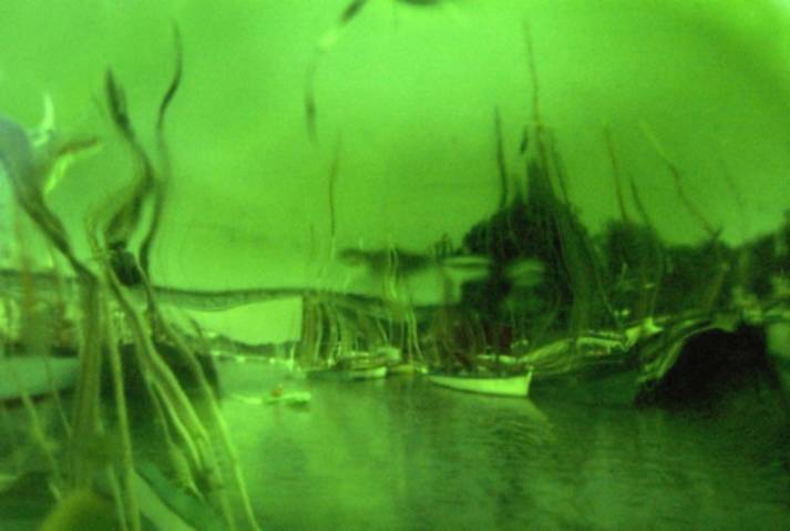 Un filtre analogique à la prise de vue, une bouée traditionnelle en verre et verte, confère naturellement aux photographies ces déformations et ce voile de couleur. Ces effets soulignent les flux et les reflux des impressions du narratif, entrainant le regard dans une contemplation vague, une fascination de soi pris dans la houle de l'existence. L'histoire, sans but de résolution, entraîne dans cette traversée intime. L'abstraction figurative des images ouvre dés lors la voix au chant des possibles, absorbé en même temps par l'attraction et la répulsion de ces vertes chimères.